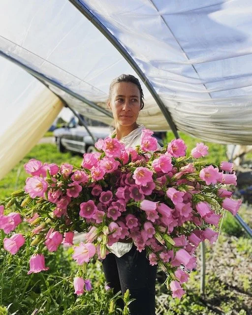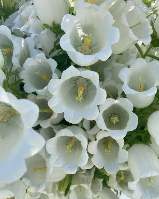 Bellflower are some of my favorite blooms. The first year I was growing flowers FOR REAL, I had a crop of bellflower, and it made me cry because I had achieved something so beautiful. I was so grateful to my farm team and to the absolute bounty of nature. These blooms feature large, cup-shaped florets in a radial pattern down the stem. Like most flowers I love, they are taller than wide, with intricate florets and lots of striking detail. They also last FOREVER in the vase - up to two weeks!