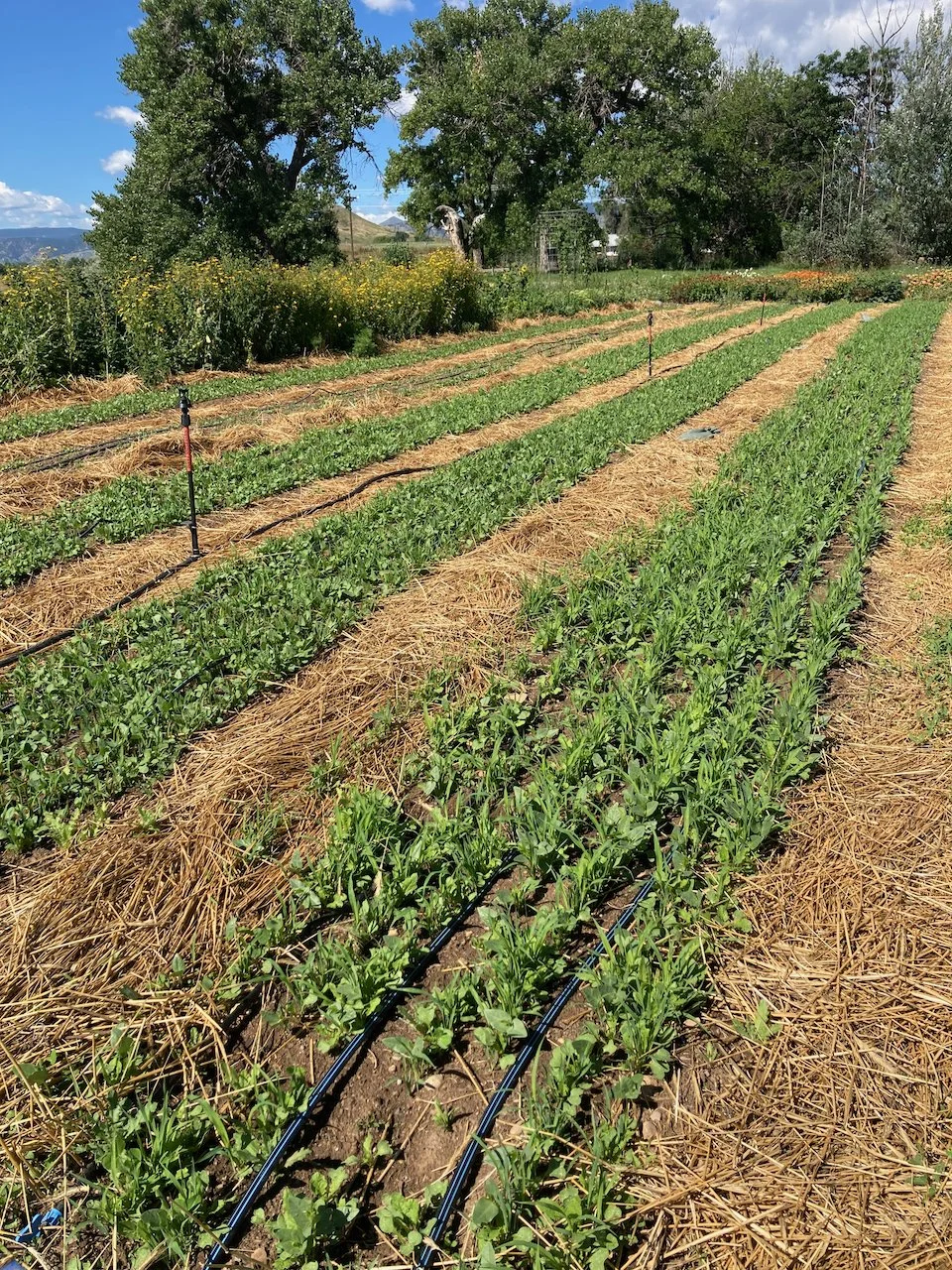 By July, we had run out of room in the rest of the field for some of our successions, so we decided to peel back the tarp and plant into the cover crop mulch. We planted marigolds and strawflowers, but the strawflowers were quickly getting eaten by grasshoppers and other creatures in the mulch. So we pulled the mulch back off the plants, into the aisles, and they began to recover. Having the mulch in the aisles meant a lot less weeding. The marigolds, being much taller, did great in the straw mulch (I imagine that’s why many veg farmers will use this technique with their tomatoes, peppers, and other tall plants). The mulch kept weeds at bay and kept the soil moisture and temperature more even. Retaining moisture in our arid climate is a must!! In rainier climates, mulch can protect the soil from the compaction of raindrops. I was really pleased with the weed-suppression that the mulch provided — this had been a very weedy section, and while some stronger weeds made it through, it was minimal compared to the last season.