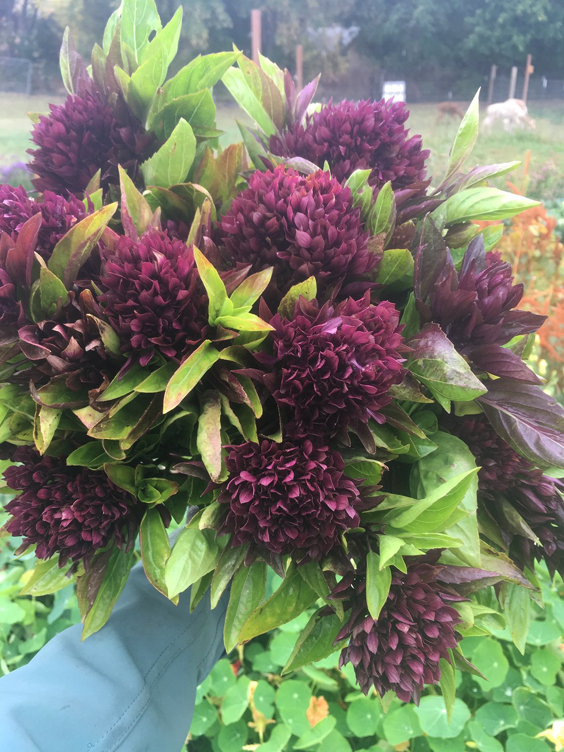 I love Aromatto and Mrs. Burns’ Lemon, but this gem stole my heart. The big burgundy bracts on top are full and lovely, and it is much less prone to wilting than other basils. It responded well to pinching. It does seem to take FOREVER to bloom, and in the field it was a wee bit shorter than I really wanted. I know it would do better in the hoop house or even a low tunnel covered with shade cloth. Johnny’s is now offering organic seed for this variety :)